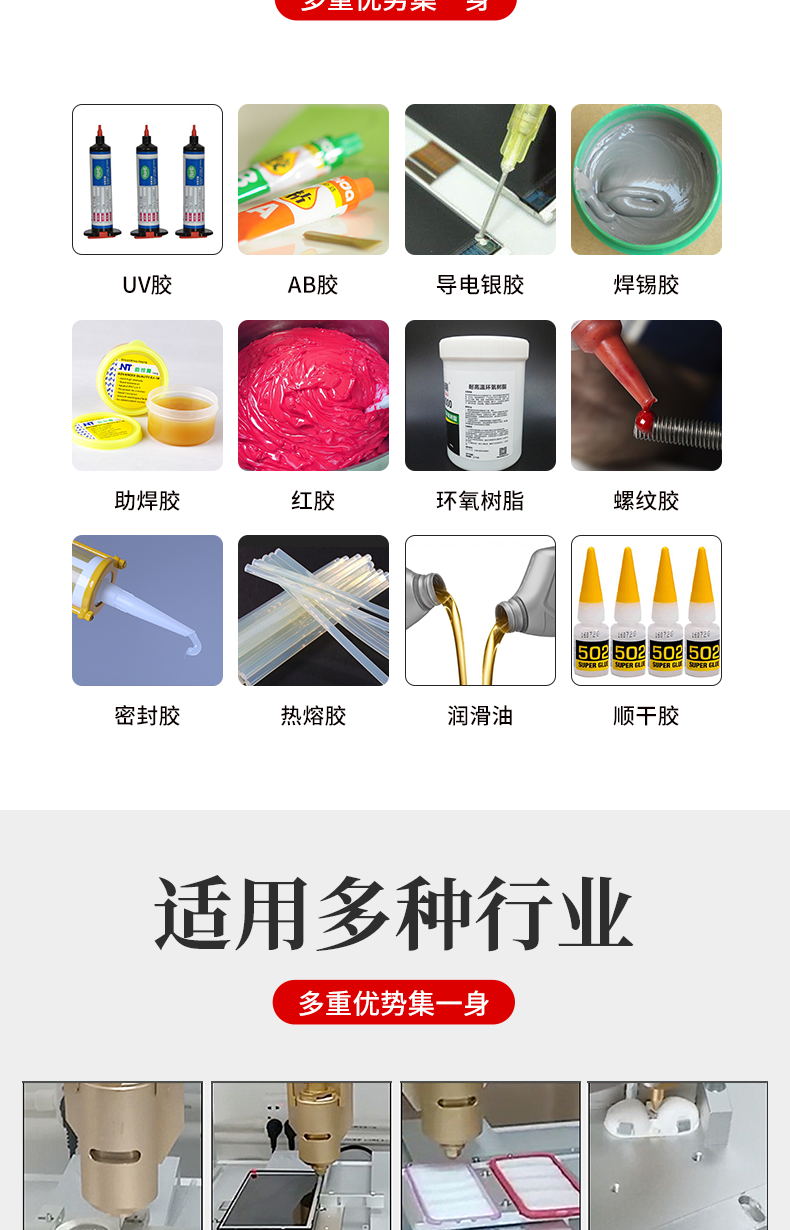 9. 適用于各式需求點膠產業,如:一般常見的 UV 膠、硅膠、silicon、紅膠、COB 黑膠、導電膠、錫膏等點膠,皆可使用再 D 系列設備上。